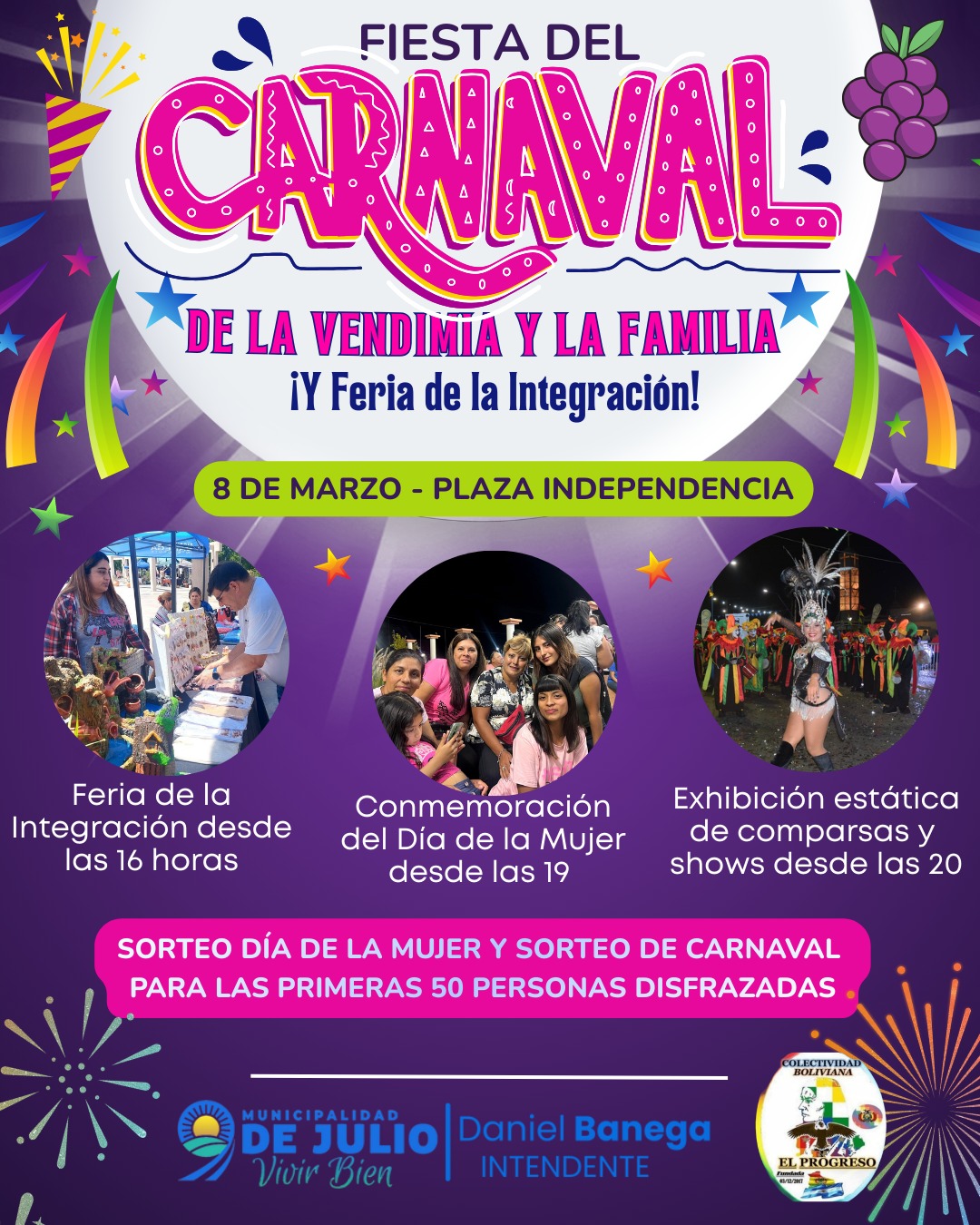 La Municipalidad de 9 de Julio invita a la comunidad a participar de la Fiesta del Carnaval de la Vendimia y la Familia, que se realizará el próximo domingo 8 de marzo en la Plaza Independencia de Villa Cabecera. Una jornada especial que pone en valor las tradiciones y raíces nuevejulinas del carnaval en esta época del año.