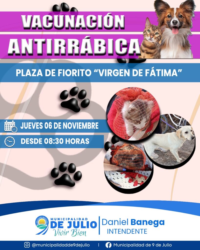 La Municipalidad de 9 de Julio, a través del área de Medio Ambiente, continúa desarrollando su campaña de vacunación antirrábica gratuita, con el objetivo de cuidar la salud de las mascotas y prevenir enfermedades transmisibles.