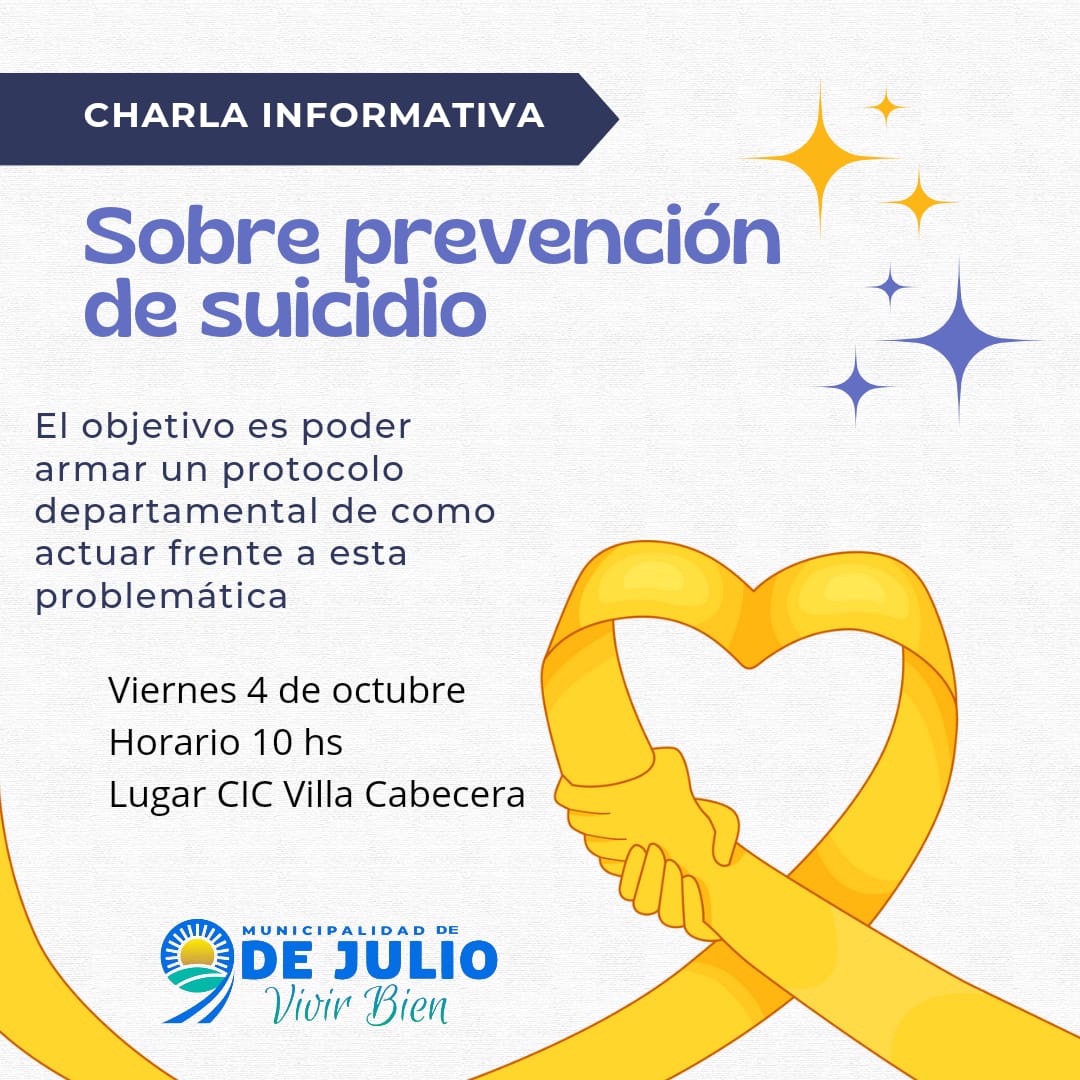 Estw próximo viernes 4 de octubre, a las 10 horas, en el Centro Integrador Comunitario de 9 de Julio, se realizará una jornada de charlas enfocadas en la prevención del suicidio. Este evento busca concientizar a la comunidad sobre la importancia de la salud mental y ofrecer herramientas para identificar señales de alerta.