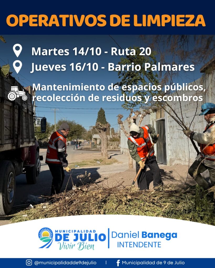 La Municipalidad de 9 de Julio informa que, en el marco del compromiso de la gestión con un departamento limpio, una meta por la que día a día se trabaja, se realizarán dos nuevos operativos de limpieza: