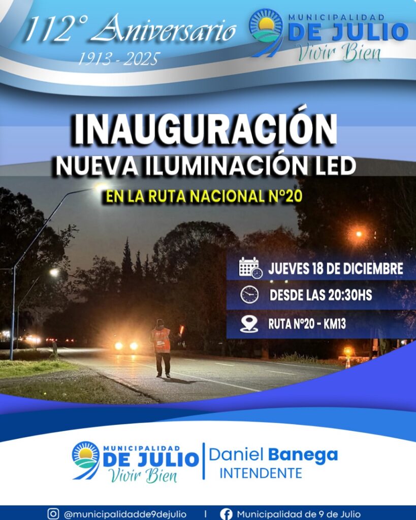la Municipalidad de 9 de julio realizara inauguración del primer tramo de nueva iluminación LED en la Ruta 20.