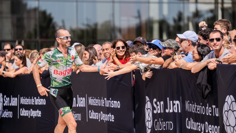 Atleta participante de IRONMAN 70.3 – SAN JUAN 2025 recibe el saludo y apoyo del público sanjuanino presente en la llegada en Plaza del Bicentenario, Capital. Créditos: Gobierno de San Juan.