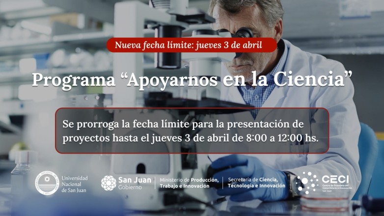 La Dirección de Promoción de la Actividad Científica y Tecnológica informa que se extiende la prórroga para la presentación de proyectos en el marco del Programa Apoyarnos en la Ciencia, debido al gran interés generado por parte de la comunidad científica de San Juan.