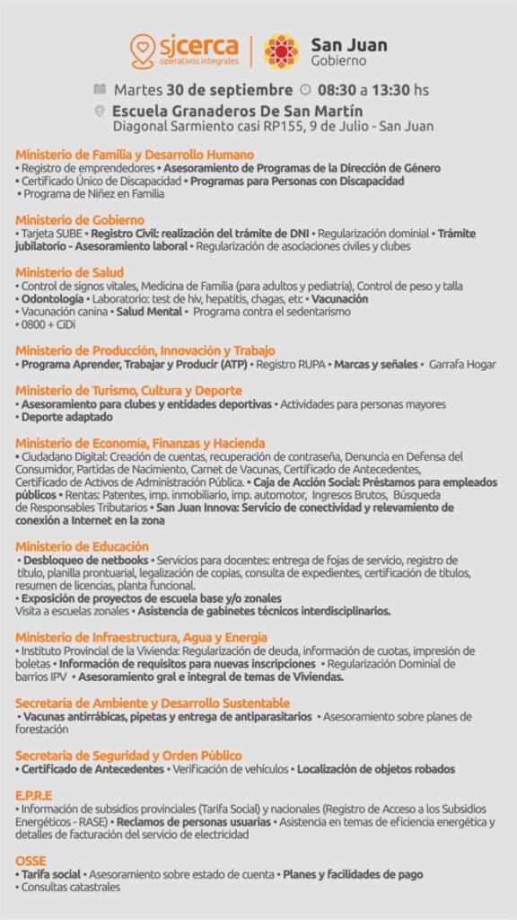 Un nuevo operativo integral San Juan Cerca tendrá lugar el próximo martes 30 de septiembre, entre las 08.30 y las 13,30, en 9 de julio. El punto de encuentro será en la Escuela Granaderos de San Martin , ubicada en Diag. San Martín , villa cabecera Hasta allí podrán llegar todos los interesados en hacer todo tipo de trámites y consultas, sin tener que trasladarse hasta el Centro Cívico.