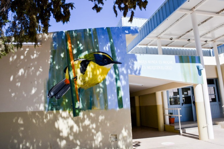 El mural fue realizado en la Escuela Mercedes Nievas de Castro. La obra fue creada por el artista Marcos Díaz Rossi, y busca fomentar conciencia sobre la importancia de las aves en libertad y alertar sobre la problemática del tráfico ilegal.