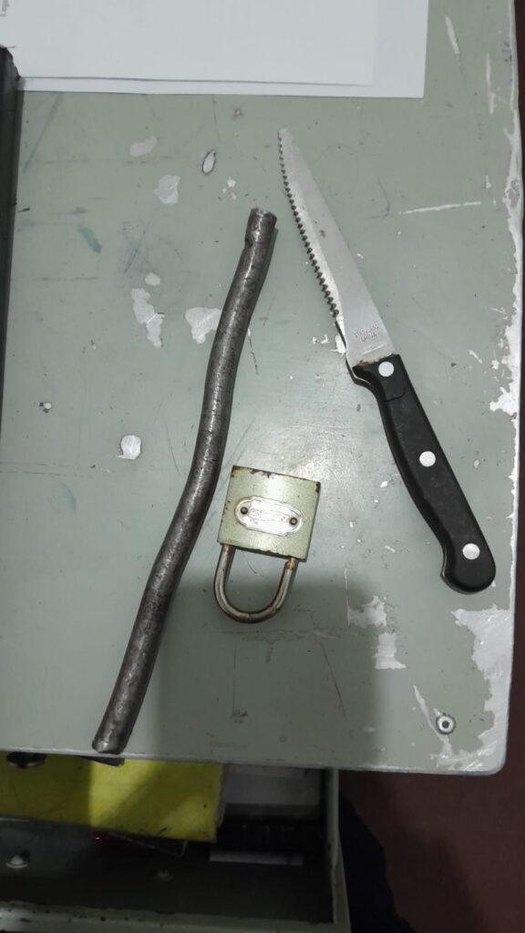 Durante el forcejeo, se le cay贸 un cuchillo tipo serrucho y un hierro de 20 cm. Flores amenaz贸 a los propietarios con represalias si llamaban a la polic铆a. La polic铆a lleg贸 al lugar y procedi贸 a la detenci贸n de Flores, quien presentaba golpes en el cuerpo.