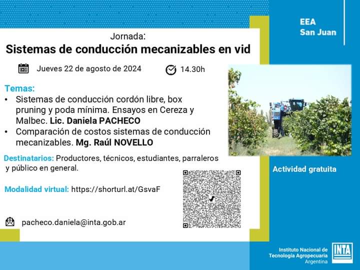 #AgendaINTA✅ Jornada: “Sistemas de conducción mecanizables en vid.”📆Jueves 22 de agosto de de 2024⏰ 14.30 h📍Lugar: Modalidad virtual a través del siguiente enlace:https://shorturl.at/GsvaF➡Más información: Lic. Daniela Pacheco, pacheco.daniela@inta.gob.ar#INTASanJuan#viticultura
